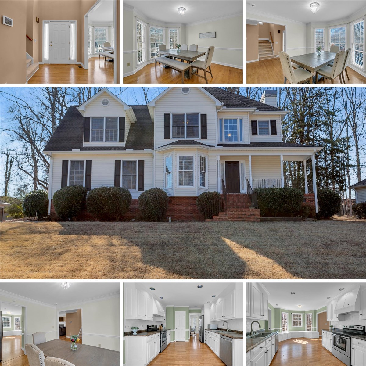 Located in the well-established Martins Grove neighborhood, this traditional two-story home offers space, character, and an unbeatable location close to a wide variety of shopping and dining with easy access to I-385. A charming front porch welcomes you into a two-story foyer that opens to a comfortable living room featuring a wood-burning fireplace and built-in cabinetry perfect for a beverage server when entertaining. The layout flows seamlessly into the spacious kitchen, thoughtfully designed with white cabinetry, a beautiful wood range hood, stainless steel appliances, tiled backsplash, pantry, and ample counter and cabinet space. A sunlit breakfast nook with a bay window highlights the custom built-in bench seating with hidden storage, adding both charm and everyday functionality. A large laundry room just off the kitchen includes a pocket door and functions as a convenient drop zone from the roomy two-car garage. The laundry/drop-zone leads to a full bathroom for added guest convenience. The elegant, front dining room with bay window completes the main floor. Upstairs, you will find three bedrooms and two full baths, including a spacious primary suite with walk-in closet, dual vanity, jet tub, and separate shower, plus a flex room or study just off the suite. Outdoor living is easy with a large deck overlooking a private backyard—ideal for barbecues and gatherings. With classic details like crown molding, chair railing, thoughtful design elements, and almost no carpet throughout, this traditional home delivers character, space to grow, and outstanding value—do not miss the opportunity to make it yours.