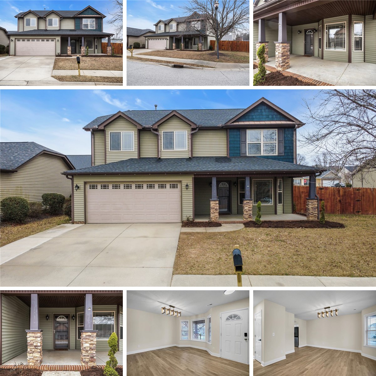 Located in the desirable Chartwell Estates neighborhood of Greer, this well-maintained and thoughtfully updated home is zoned for Riverside Middle and High Schools and offers convenient access to I-85, GSP Airport, the charming downtown Greer, and a wide variety of shopping and dining. This community is friendly and walkable, featuring sidewalks throughout, a grand clubhouse, and neighborhood pool. An expansive, covered front porch welcomes you. Inside, the updated kitchen (2022) features quartz countertops with a waterfall edge, custom tile backsplash, painted cabinetry, updated lighting, pantry, and quality appliances including a Bosch dishwasher, induction cooktop with self-cleaning convection oven, and microwave convection combo. Arched openings and rounded drywall corners add subtle architectural detail throughout the main living spaces. The spacious living room includes a gas log fireplace with a traditional mantel, and the formal dining room is highlighted by a bright, bay window. Upstairs features a huge laundry room, an updated hall bathroom with a new vanity, and a spacious primary suite with a double sink vanity, garden tub, and large walk-in closet. Outdoor living is enhanced by an extended patio across the back of the home, while the corner lot and fully fenced backyard provide added privacy. Other updates include LVP throughout main level (2022), roof replacement in 2021, new HVAC A/C condenser unit (2025), fresh interior paint (2025), all new carpet (2025), new Andersen front storm door (2025), extended concrete patio (2022), extended driveway width for extra parking (2022), two commodes replaced (2025), and new garage door motor (2025). This move-in-ready home offers solid updates, functional spaces, and a highly convenient Greer location within an established neighborhood.
